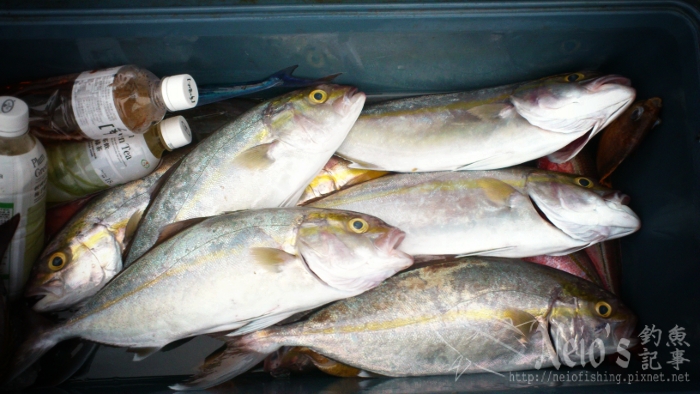 這次運氣就稍微好一點,四個人每人都有獎,運氣好的阿茂老是首先吃鉤,明明他鐵板才用 100g 沉的慢很多,也比我們用 180g 的少下好幾竿,可是每次都是他先開胡,真不知道該說是他運氣好還是我們真的太背!好在中午蓋的這幾套流 neio 也騙上三尾咪咪魽,雖不是好成績但在今天也能排個第二了。